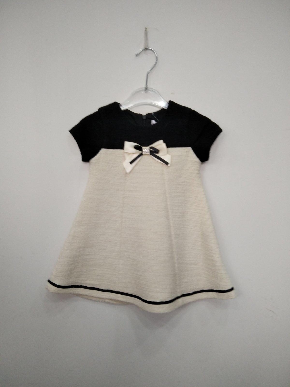 Φόρεμα κ/μ μαύρο μπουκλέ ύφασμα στο στήθος και στα μανίκια, όμορφο φιόγκο μπροστά, και από το στήθος και κάτω εκρού ίδιο ύφασμα που ανοίγει σε άλφα γραμμή, με λεπτομέρεια από σατέν κορδέλα στο τελείωμα.