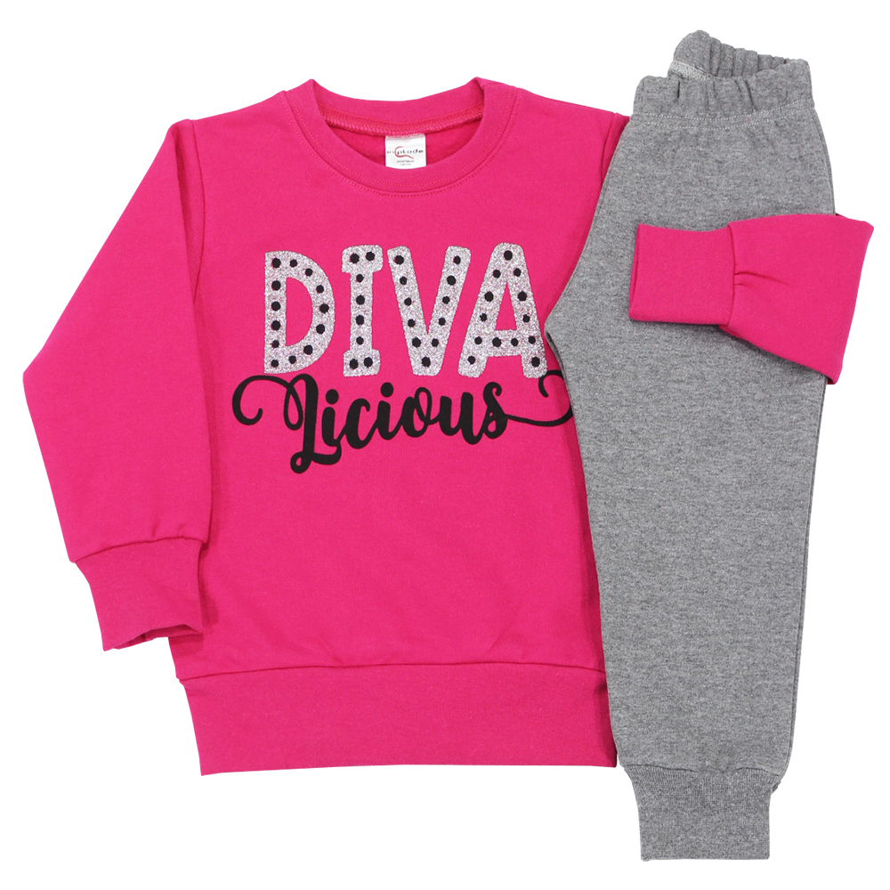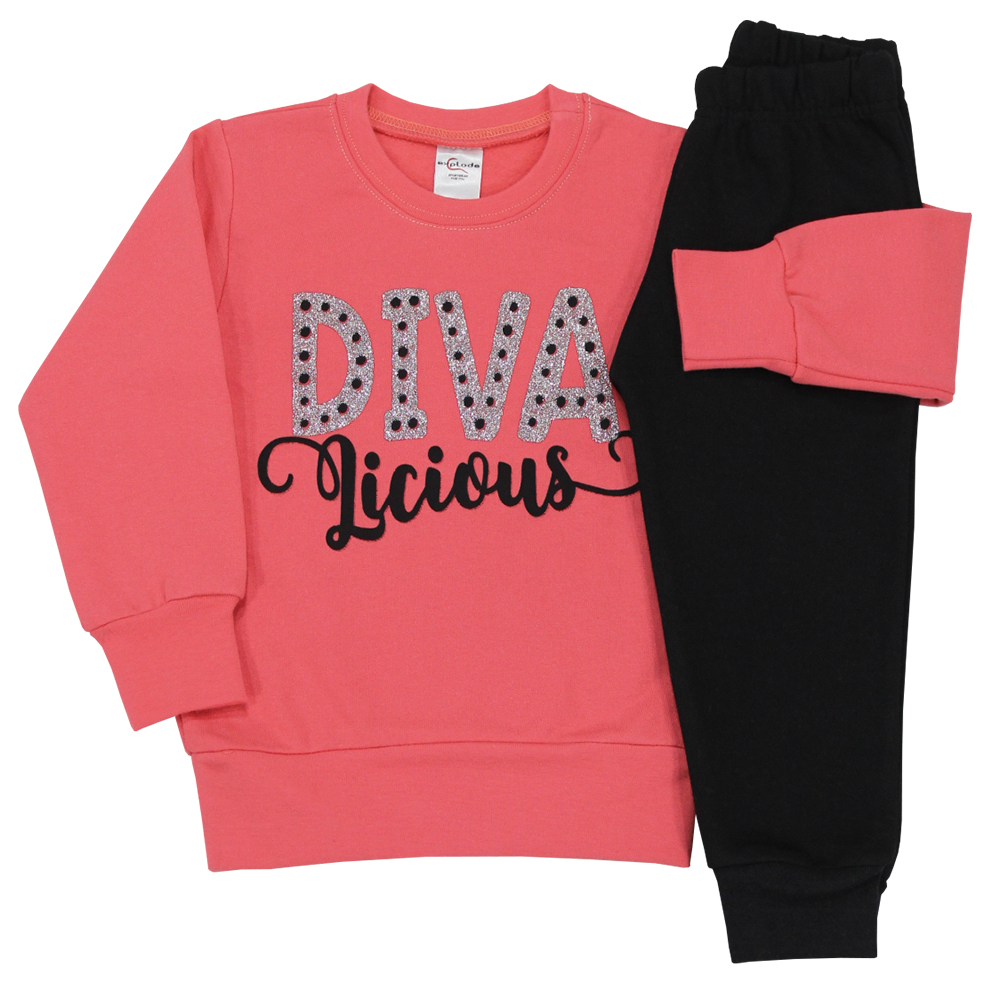 Φόρμα με τύπωμα και λεπτομέρειες στρας. Λάστιχο στο λαιμό και στα μανίκια, μονόχρωμο παντελόνι.